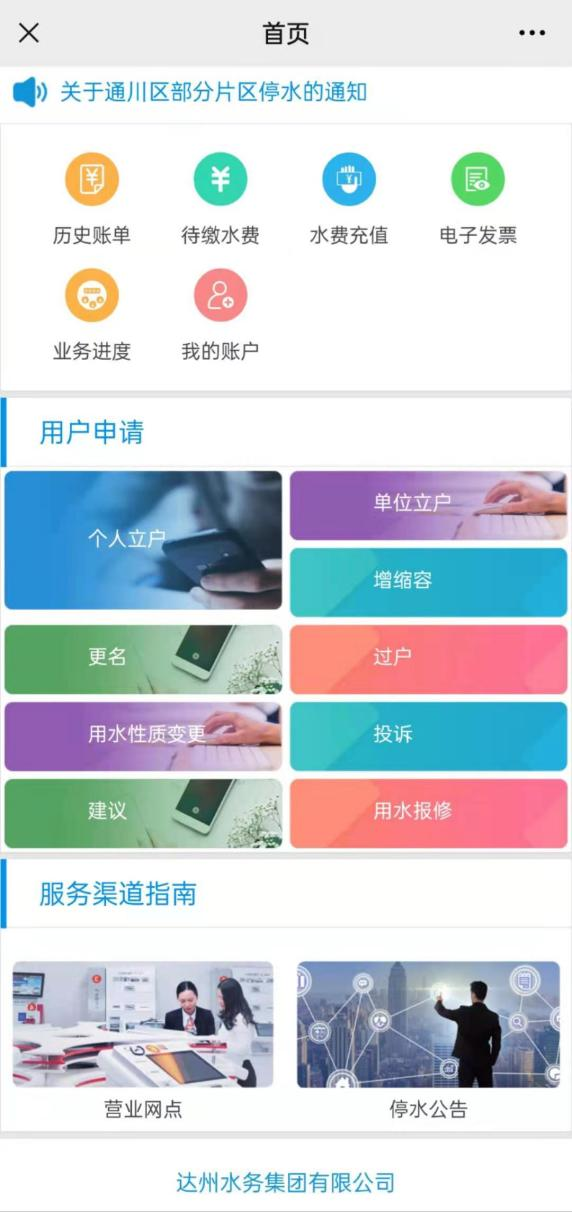 達(dá)州水務(wù)“微營業(yè)廳”已正式進(jìn)駐“達(dá)州水務(wù)集團(tuán)有限公司”微信公眾號,關(guān)注微信公眾號,多項(xiàng)供水業(yè)務(wù)均可網(wǎng)上辦理。用水報裝、更名過戶、增縮容、用水性質(zhì)變更、用水報修、水費(fèi)查詢、充值繳費(fèi)、電子發(fā)票下載等業(yè)務(wù)均可“掌上辦”。